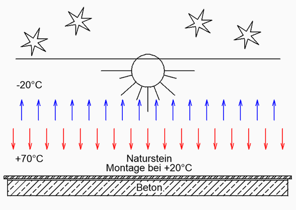 Daher baut sich zwischen dem Materialkern und dem Materialmantel ein Wärmespannung auf. Wird bei Natursteinen der kritisch Wert überschritten kommt es zu Rissbildungen.