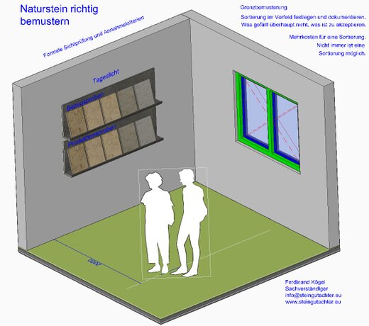 Auf den Proben muss vermerkt sein der Name und Anschrift des Lieferanten, oder Herstellers, die Gesteinsbezeichnung nach Pkt. 4.2.2Der Vergleich der Produktionsprobe mit der Bezugsprobe muss in einem Abstand von etwa 2 m und bei üblichem Tageslicht durchgeführt werden.